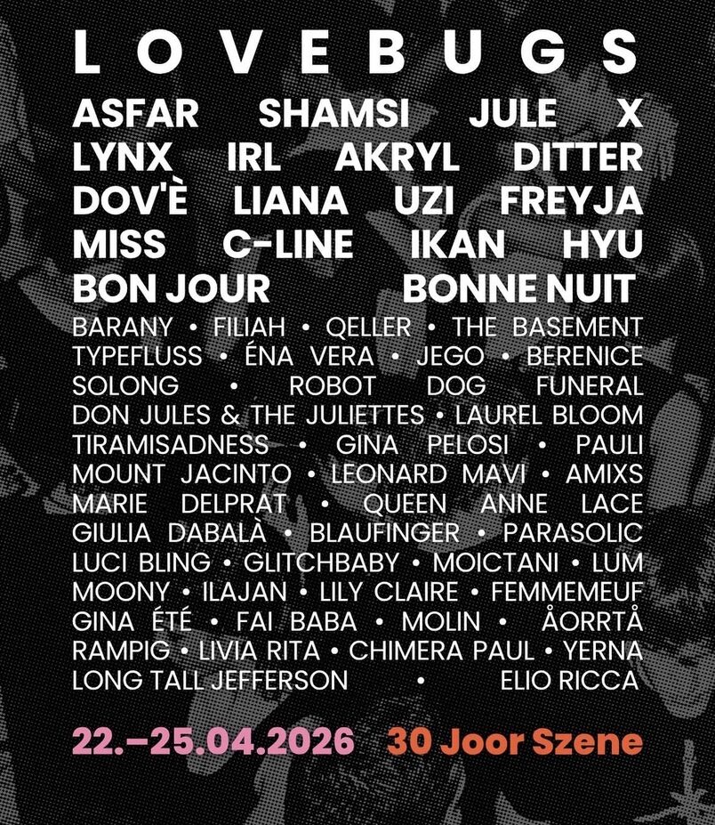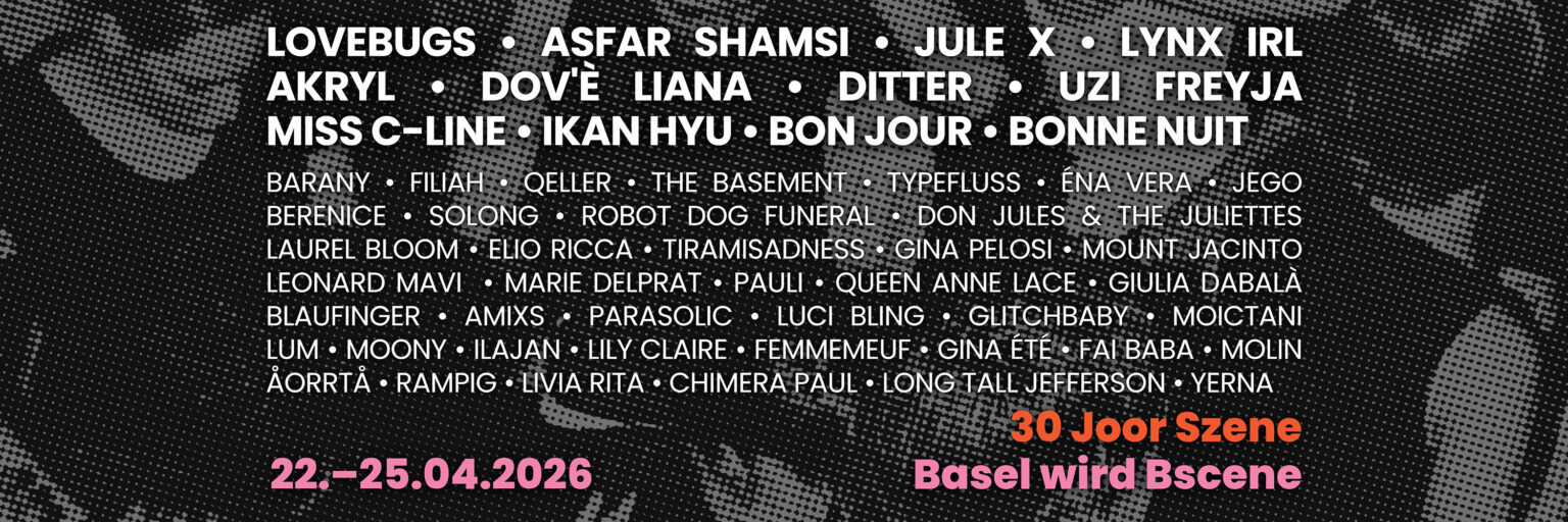 Seit 30 Jahren ist die BScene ein fester Teil von Basel. Entsprechend schwer fiel uns die Absage der letzten Ausgabe. Aber für uns war klar: Wir setzen aus, um zurückzukehren und gemeinsam mit euch unser 30-jähriges Jubiläum zu feiern. Im April 2026 bringt die Jubiläumsausgabe die BScene auf die Bühnen der Region. Vier Tage lang, in zwei Kantonen, verteilt auf elf Clubs mit insgesamt 49 Konzerten.